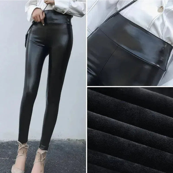 가죽 바지 여성용 두꺼운 라지 사이즈 하이 웨이스트 PU 가죽