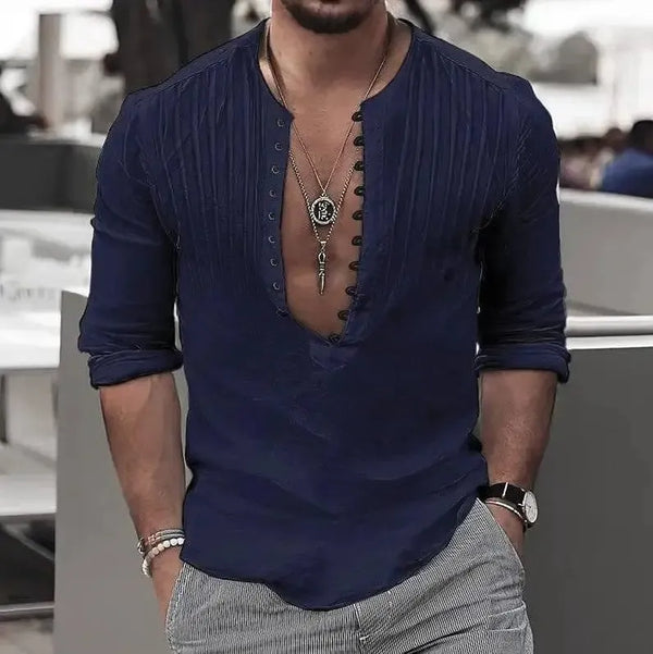 남성 캐주얼 루즈 버튼 코튼 라운드넥 셔츠