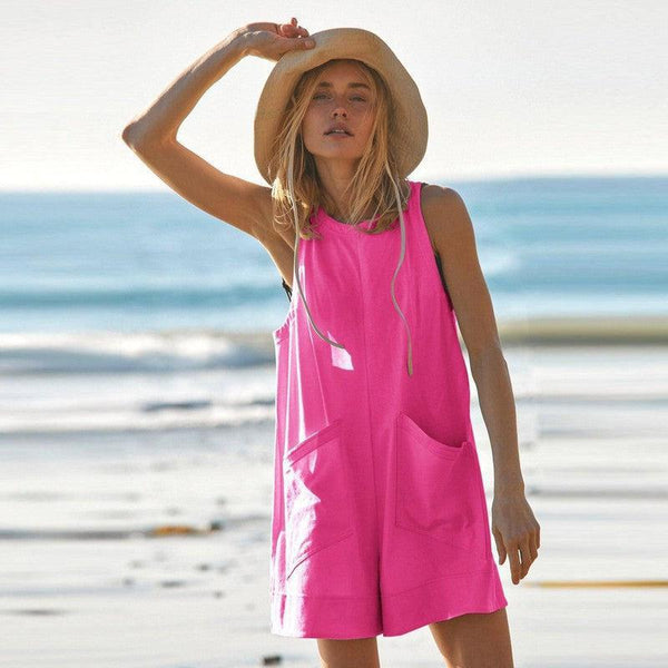 한 색상 주머니가 있는 루즈핏 점프수트 패션 여름 핑크 / L