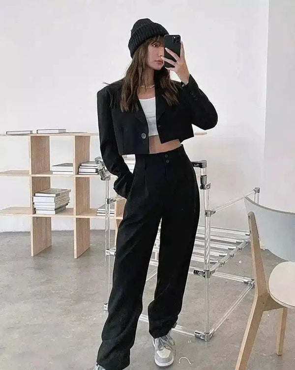 - 의류 유형: 크롭 블레이저와 하이웨이스트 팬츠가 특징인 투피스 앙상블