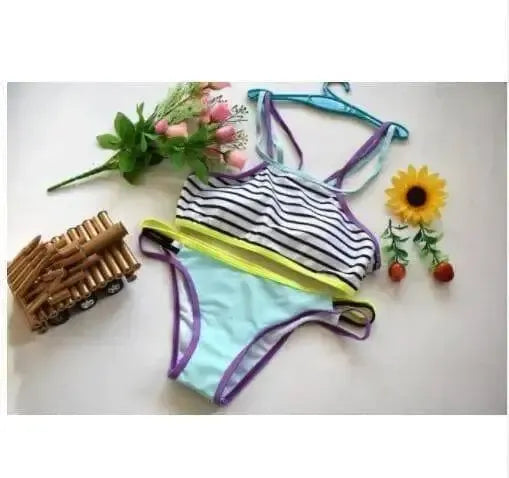 스트라이프 하이넥 패치워크 비키니 세트 수영복 입욕제