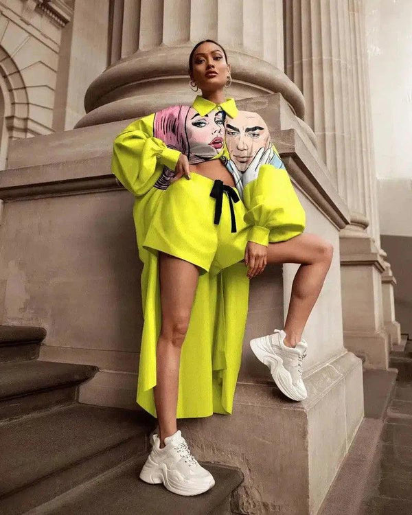 - 추가 디테일: 앞면 그래픽 디자인, 하이 로우 실루엣으로 이어지는 스플릿 밑단