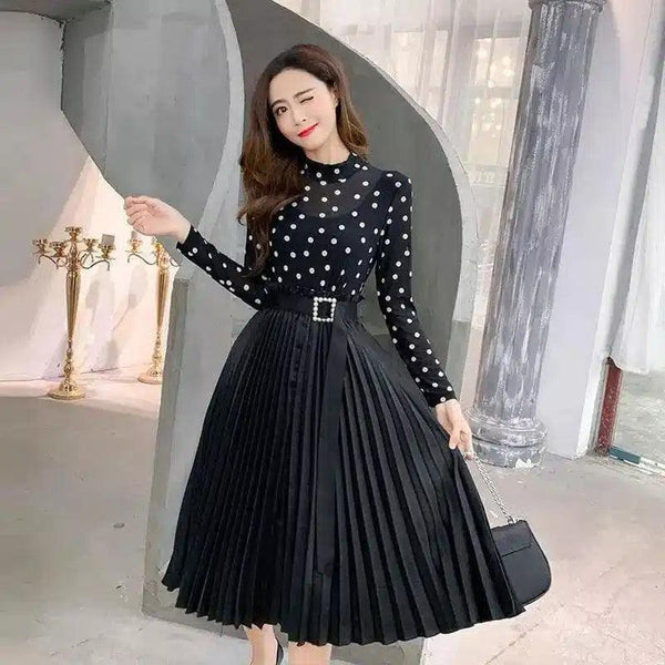 폴카 도트 플리츠 미디 드레스 & 벨트