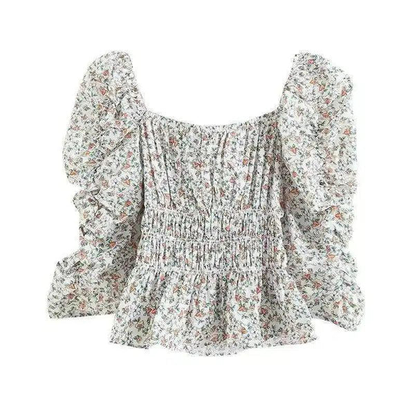 여성용 플로럴 스모크 퍼프 슬리브 탑
