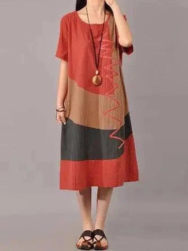 S-5XL 여성 캐주얼 반팔 스플라이스 루즈 오넥 미드 롱