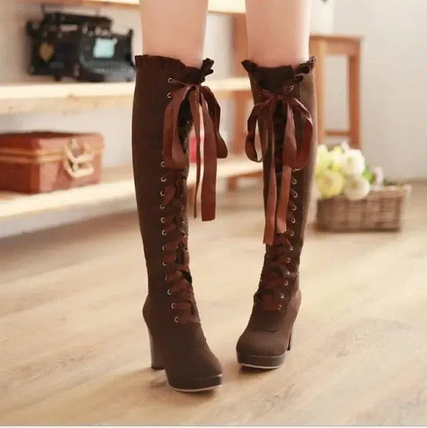 여성용 벨벳 스트랩 하이힐 톨 부츠