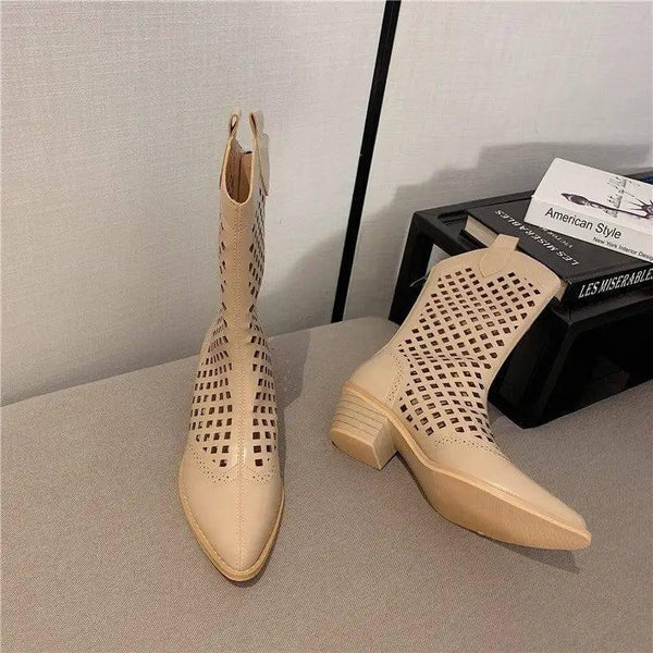 포인티드 웨스턴 카우보이 부츠 여성 얇은 중공 기사 두꺼운