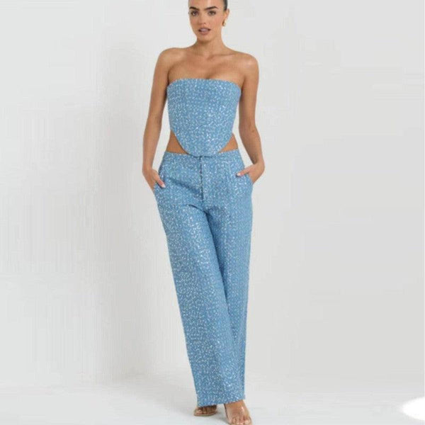 - Product Type: Denim Sequined Tube Top and Wide Leg Pants Suit