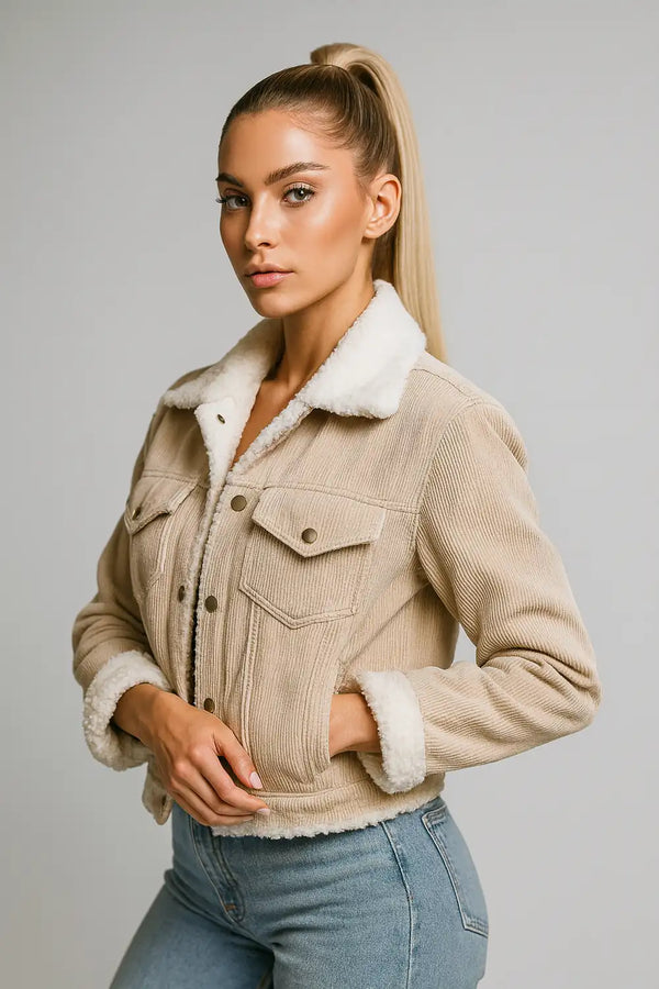 Add earthy texture to your wardrobe with this beige corduroy jacket, a season-ready staple. Designed with soft yet durable ribbed fabric, it features a relaxing fit that layers effortlessly. Snap buttons, chest pockets, and a roomy collar give it vintage-inspired flair, while neutral beige tone pairs with everything from white tees to chunky knits. Whether you're heading out for a casual brunch or wrapping up for an evening walk, this corduroy jacket brings warmth, comfort, and timeless style.