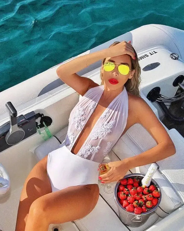Product Description: Embroidered Halter Lingerie Siamese Bikini