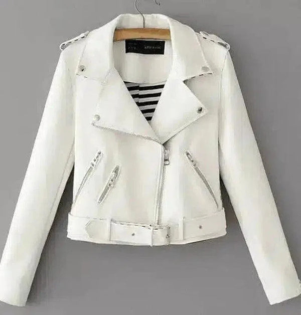 Incorporate this white faux leather moto jacket into your wardrobe to add a touch of elegance and