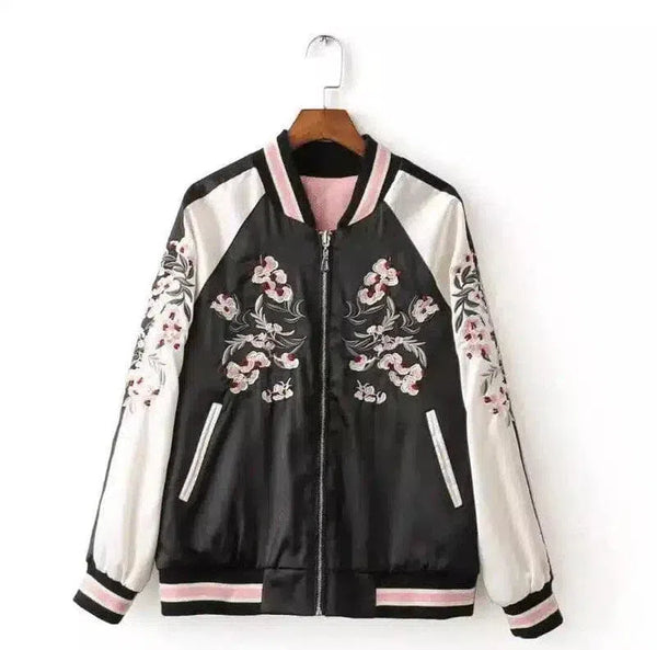 - Additional Details: Front Zip Closure, Ribbed Cuffs and Hem, Side Pockets with Zip Closure, Embroidered Floral Design on Front and Sleeves