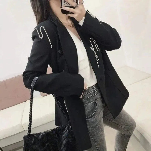 - Bold Fashion Statement: Make a bold statement with this blazer's striking black color and contrasting pearl details, sure to stand out in any setting.