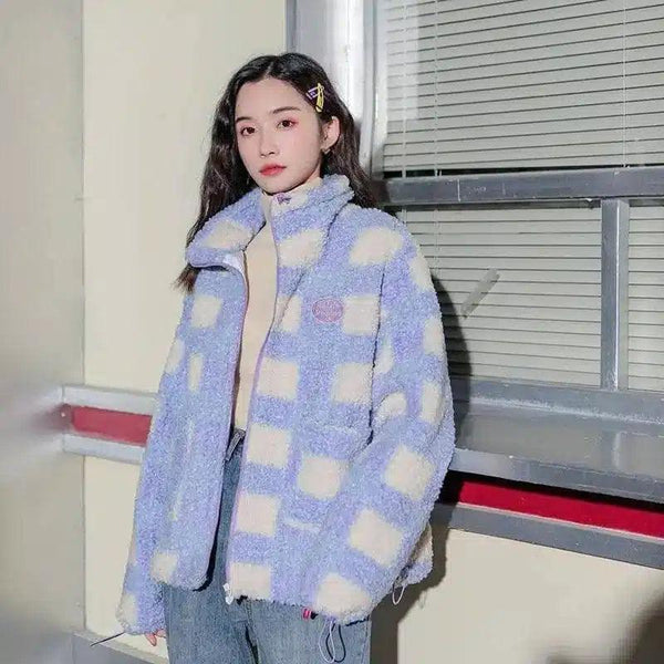 Ladies Faux Lamb Velvet Warm Wool Check Jacket