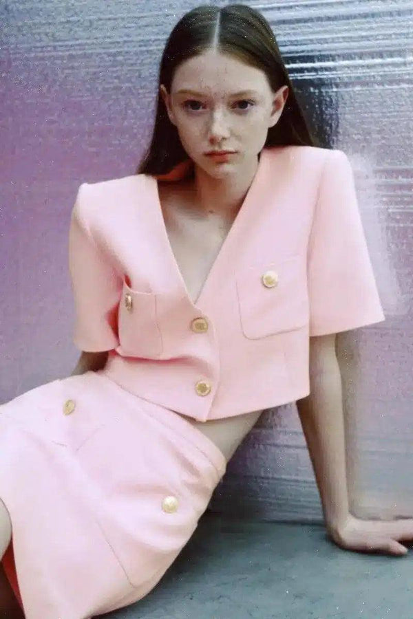 - Type of Garment: Two-piece set featuring a cropped top and skirt