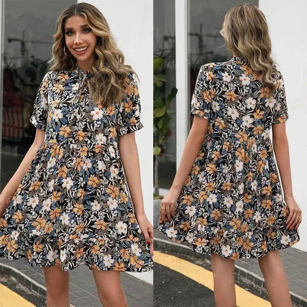 Stand Collar Ruffle Small Floral Short Sleeve Dress