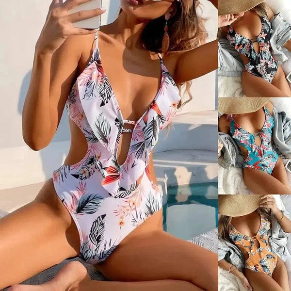Triangle One Piece Leaf Print Ruffle Swimsuit