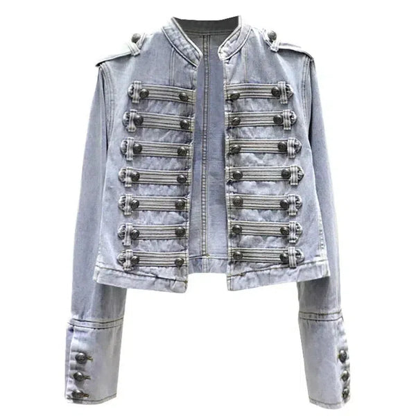 Channel timeless sophistication with this retro military-inspired denim jacket. Featuring a structured silhouette, double-breasted details, and a stand collar, this jacket adds a bold edge to your wardrobe. Its unique design blends vintage charm with contemporary denim trends, making it perfect for statement-making outfits.
